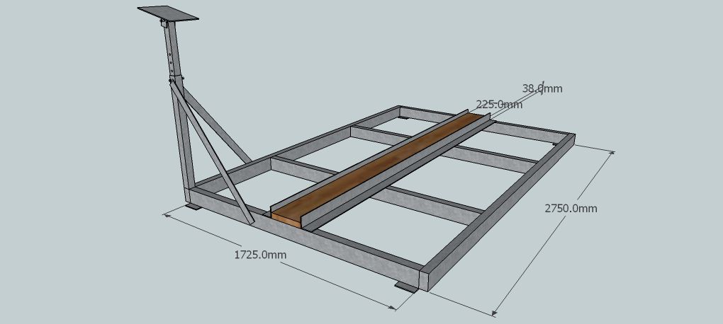 It is made from 100 x 50 mm square hollow steel tube, MIG welded together and painted with Red oxide. Each castor can hold 850kg bought from RS components.